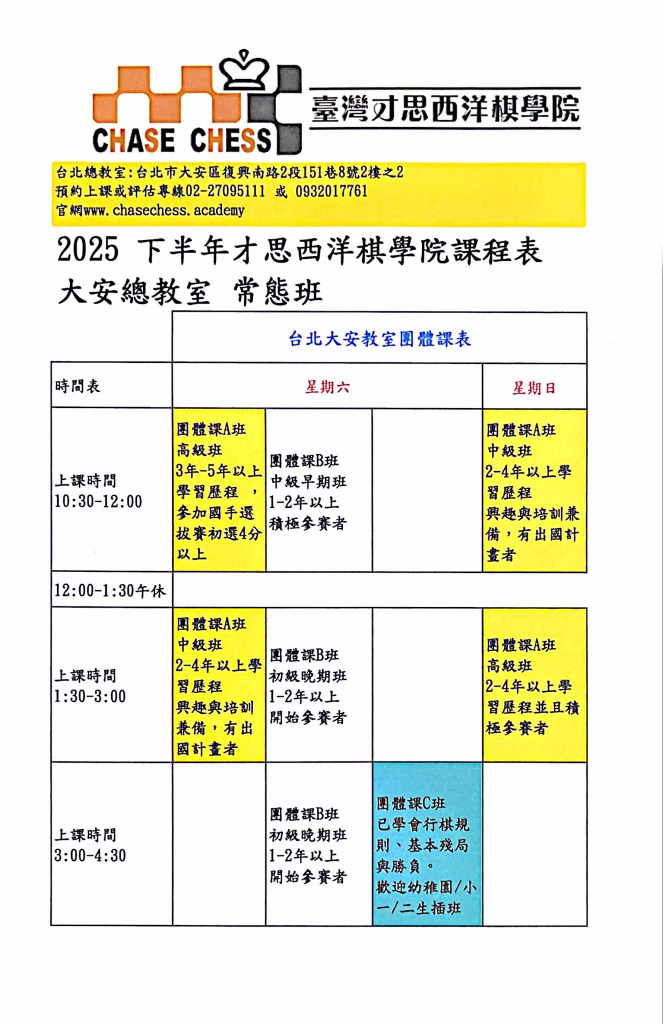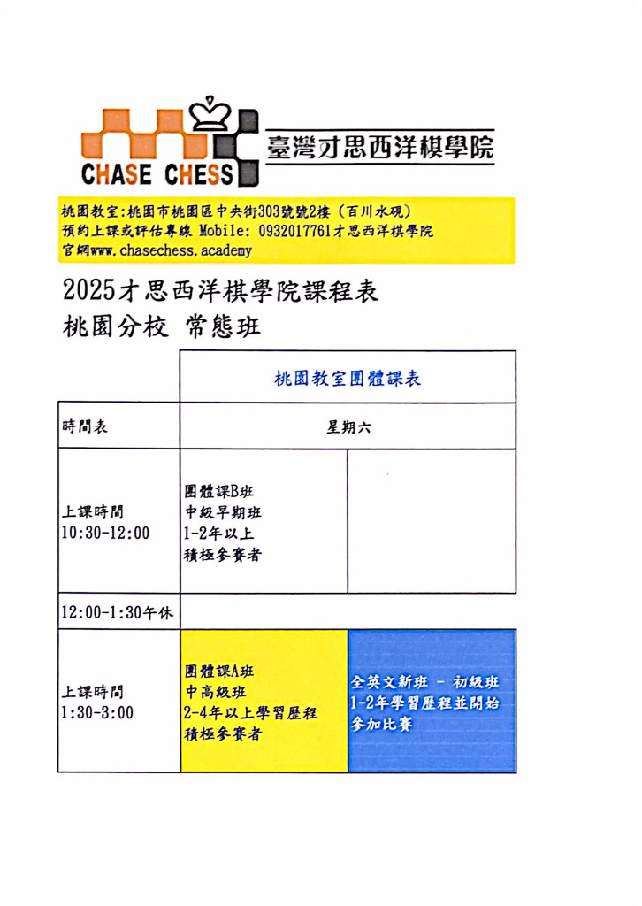 您正在瀏覽才思西洋棋學院的官網 歡迎選課;Please e-mail us at TaiwanChaseChess@gmail.com for more information. Dismiss